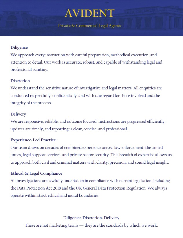 Avident provides professional investigative, process-serving, and training services delivered with diligence, discretion, and precision. We are instructed on a wide range of personal, commercial, and legal matters, operating nationwide with the support of a trusted and well-established network of associates to ensure consistent, reliable coverage across the United Kingdom. Our work is grounded in ethical integrity, clear and transparent communication, and a commitment to delivering accurate, legally compliant results that stand up to scrutiny in both legal and regulatory settings.